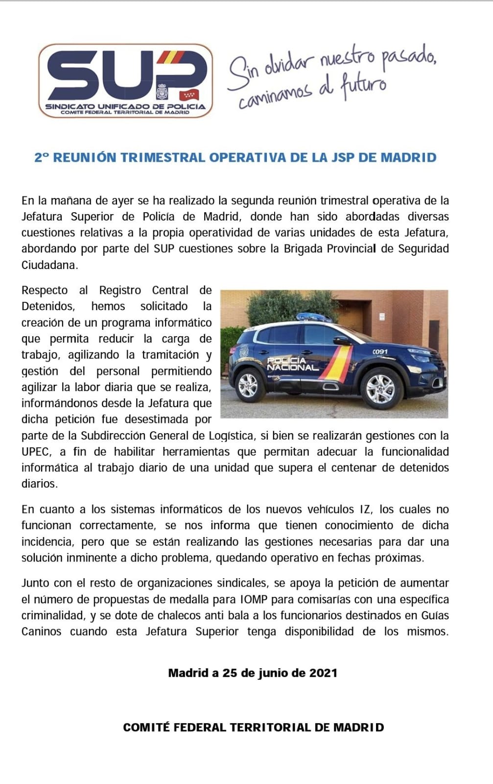 En esta circular os resumimos los temas más importantes que se han tratado en la reunión con la JSP de Madrid, incluyendo las propuestas de mejora que SUP Madrid ha trasladado sobre varias Unidades de la BPSC, así como la mejora del sistema informático del IZ que está presentando varios fallos que afectan al servicio policial.