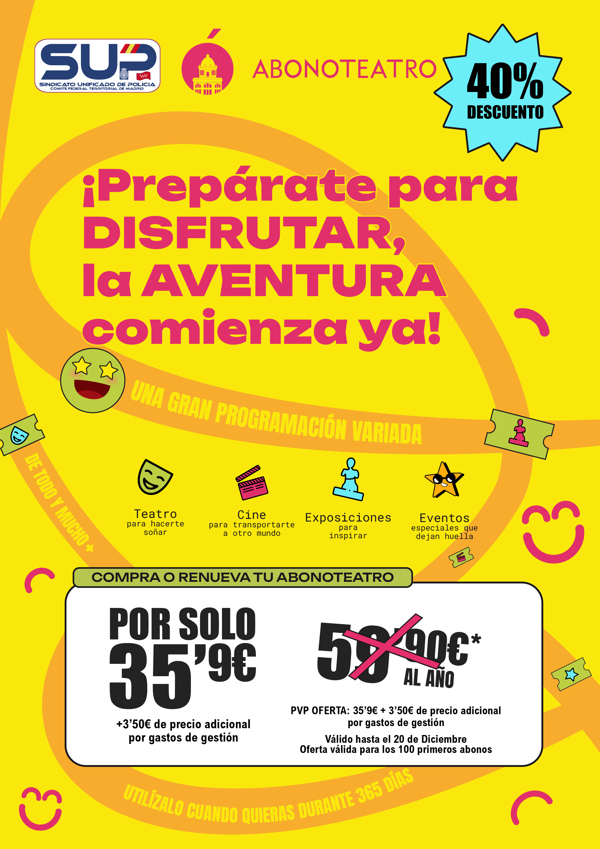 Válido del 1 de Septiembre hasta el 20 de Diciembre, y al adquirir dicho abono podrás disfrutar de obras de teatro, monólogos y conciertos, solo pagando por los gastos de gestión.