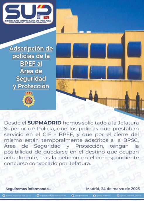 Desde SUP Madrid solicitamos a la Jefatura Superior de Policía, que los policías adscritos provisionalmente al Área de Seguridad y Protección de la Brigada Provincia de Seguridad Ciudadana (con motivo del cierre del CIE) puedan pedir en el concurso convocado por Jefatura y quedarse en el destino que actualmente ocupan.