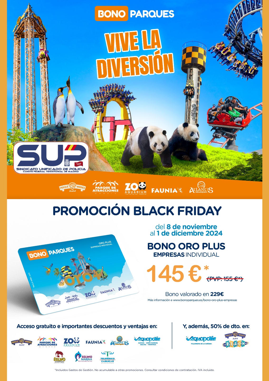 Desde hoy hasta el 1 de diciembre de 2024, el Bono Parques Oro Plus Empresas 2025 podrá adquirirse a 145 €, en lugar de su precio ya bonificado de 155 €.