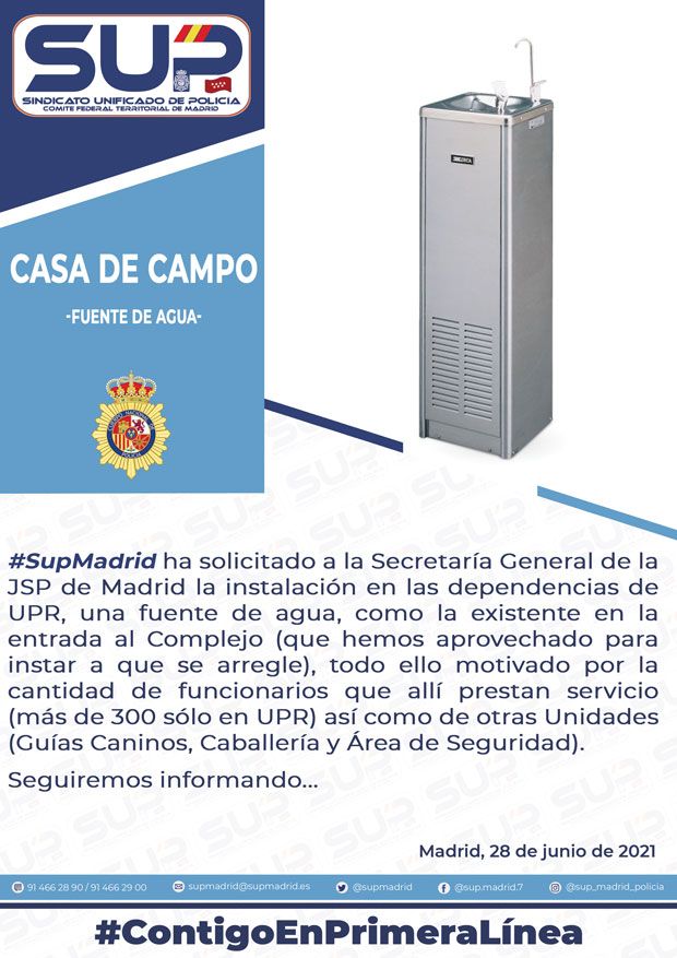 SUP ha solicitado a la Secretaría General de la JSP de Madrid la instalación de una fuente de agua potable, como la que se encuentra en la entrada al Complejo (hemos aprovechado para solicitar que la arreglen). Creemos que es necesaria esa fuente para cumplir con la normativa vigente, ya que solo en UPR hay más de 300 funcionarios, a parte del resto de Unidades, como Guías Caninos, Caballería y Servicio de Seguridad.