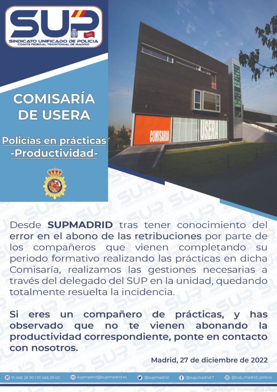 Tras recibir la información de varios errores en el abono de productividad de los Policías en prácticas de esta Comisaría, SUP realiza gestiones a través del delegado para solucionarlo. Si no te abonaron correctamente la productividad contacta con tu delegado o con nuestro Comité Federal Territorial.