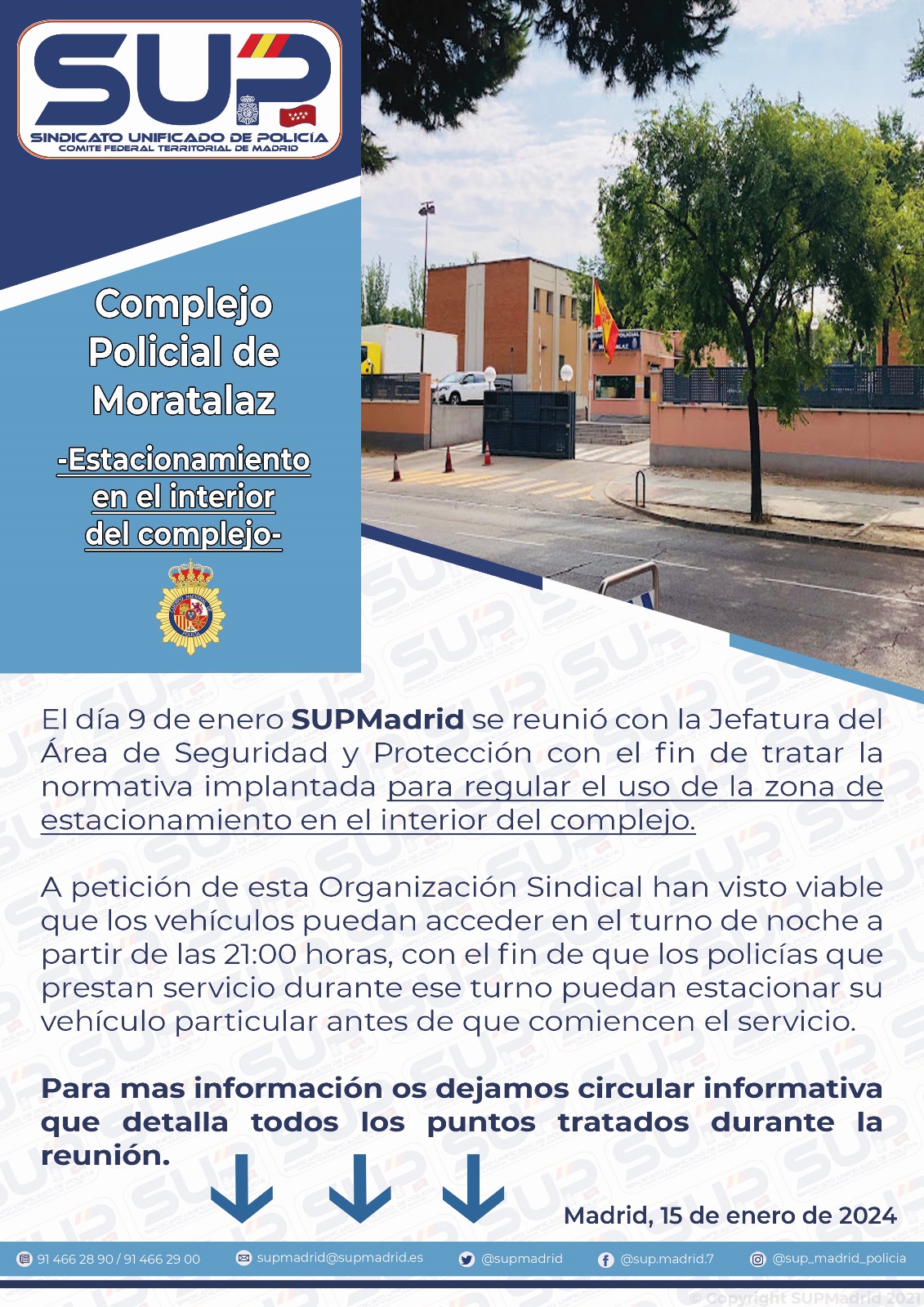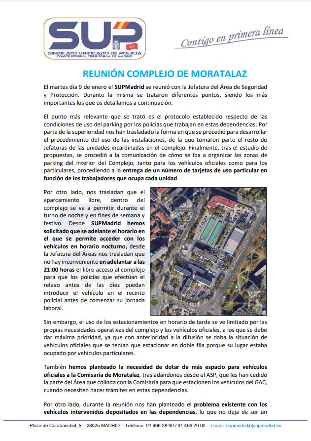Gracias a la petición formulada por el SUP Madrid en la reunión mantenida con la Jefatura del Área de Seguridad y Protección de Moratalaz, los vehículos podrán acceder a partir de las 21:00 h. con el fin de que los policías puedan estacionar antes del inicio del servicio.