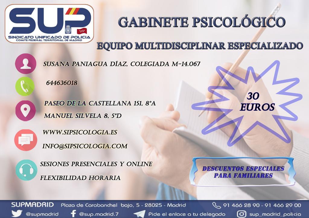 SUP Madrid cierra este gran acuerdo con un gabinete psicológico dotado de un equipo multidisciplinar, posibilidad de sesiones online y presenciales, flexibilidad horaria y ubicado en pleno centro de Madrid. Por ser afiliado al SUP conseguirás el mejor descuento. En el cartel os adjuntamos el nombre de la Psicóloga colegiada y el número de contacto.