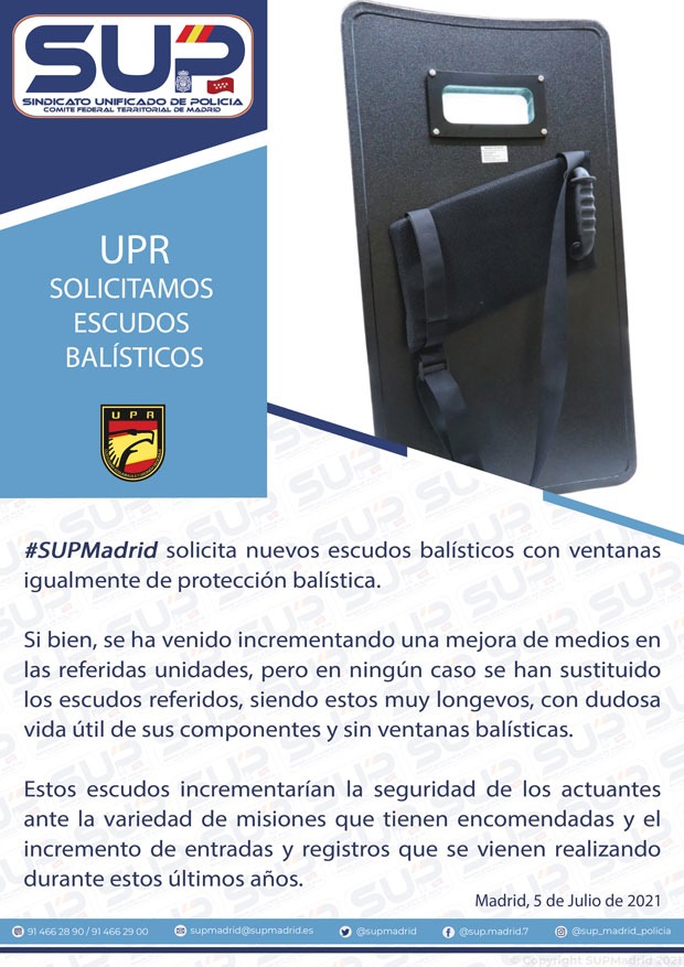SUP Madrid solicita nuevos escudos balísticos con ventana de protección balística para UPR. Es cierto que se ha ido renovando el material, pero en el caso de los escudos son muy antiguos, y sus componentes pueden estar al límite de su vida útil. Con la adquisición de este tipo de escudos se mejoraría la seguridad de los policías, y la visibilidad en las intervenciones.