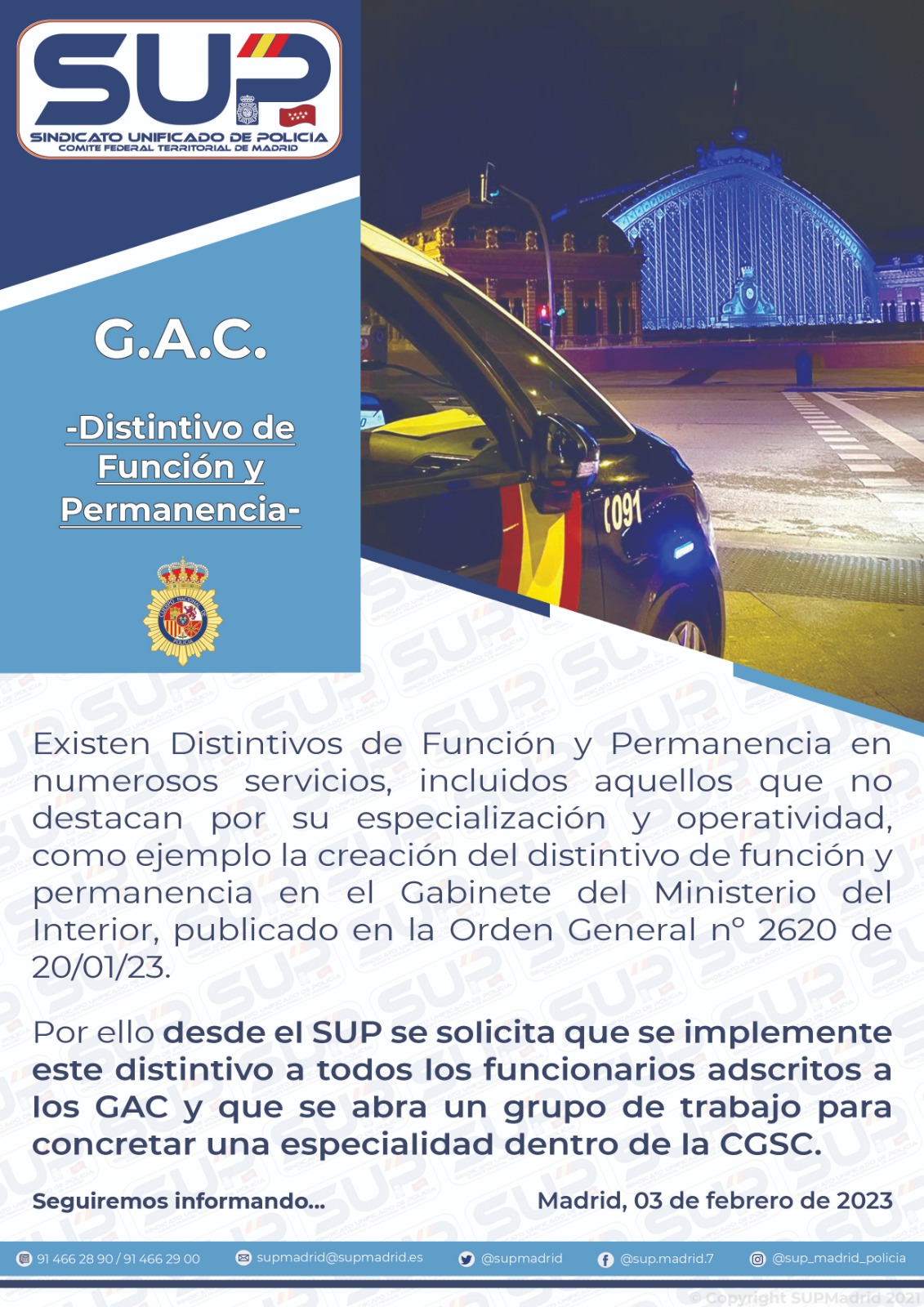 La norma contempla la creación de Distintivos de Función y Permanencia, incluso en servicios que no destacan por su especialización y operatividad. SUP Madrid solicita distintivo a todos los funcionarios adscritos al GAC y la creación de mesa de trabajo en CGSC para concretar una especialidad.