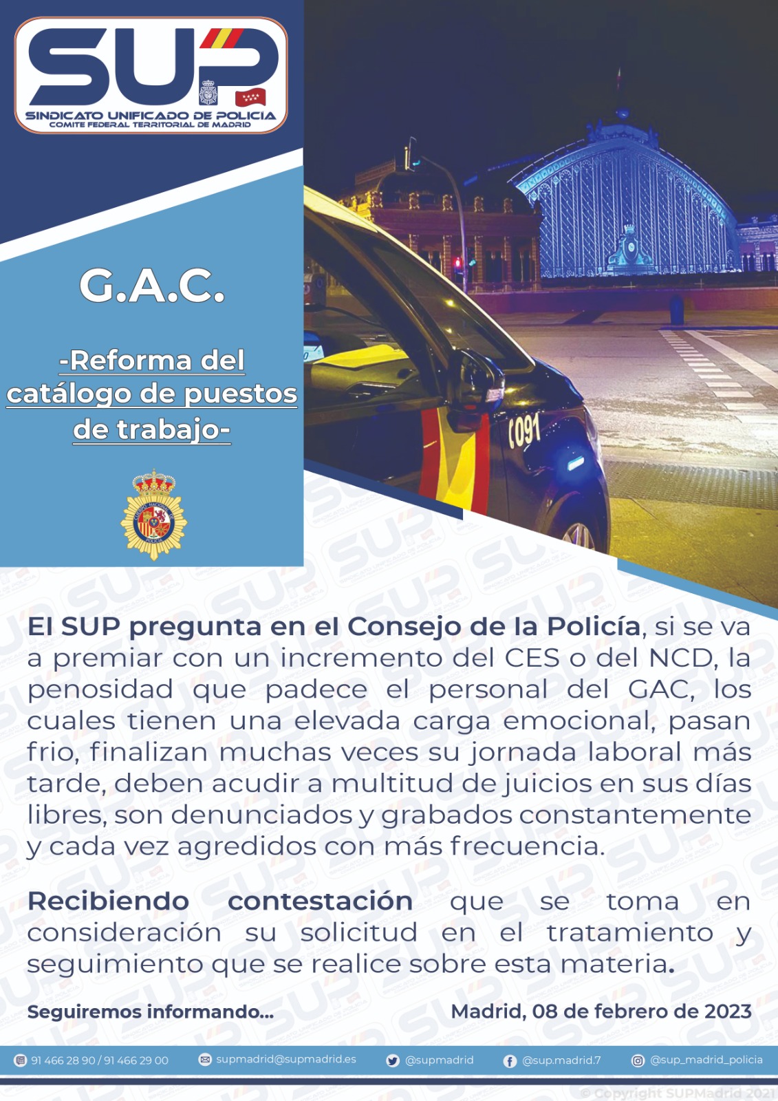 El SUP pregunta en el Consejo de la Policía, si se va a incrementar el CES o el NCD del GAC, por las condiciones de penosidad en las que presta servicio. Están sometidos a una gran carga emocional, estrés térmico, grabaciones en sus intervenciones y juicios en días libres entre otros factores. Se toma en consideración nuestra propuesta, seguiremos informando.