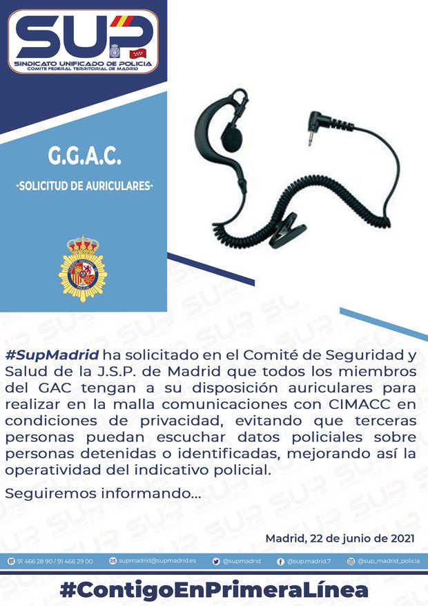 SUP Madrid solicita en el Comité de Seguridad y Salud Policial que se dote de auriculares a todos los integrantes del GAC. De este modo pueden utilizar los equipos de comunicaciones con mayor discreción, evitando que terceras personas escuchen las comunicaciones relativas al servicio policial, y mejorando de este modo la seguridad de los Policías.