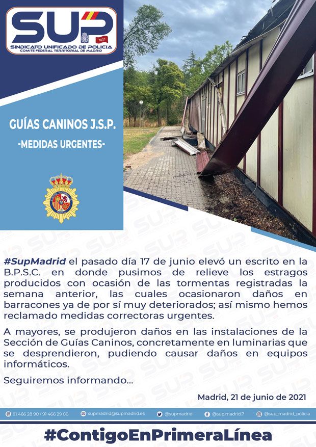 Debido a las fuertes tormentas que se produjeron en Madrid a mediados de junio, los barracones de Guías Caninos han sufrido graves desperfectos, así como daños en las luminarias que pueden ocasionar averías en los equipos informáticos. SUP Madrid por estos motivo ha solicitado a la JSP de Madrid que se adopten medidas para subsanar estos problemas con carácter de urgencia.