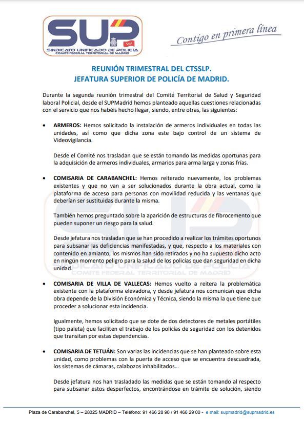 Durante la segunda reunión trimestral del Comité Territorial de Salud y Seguridad Laboral Policial (CTSSLP), desde el SUP Madrid hemos planteado aquellas cuestiones relacionadascon el servicio que nos habéis hecho llegar.