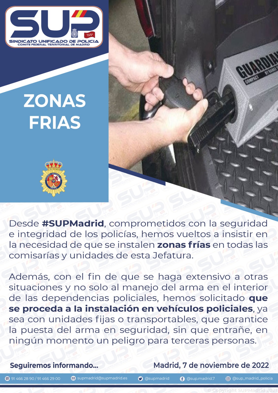 En SUP Madrid luchamos por mejorar la seguridad e integridad de los Policías Nacionales, insistimos en la necesidad de instalar zonas frías en todas las comisarías y unidades de la J.S.P. de Madrid. Solicitamos también que se instalen en vehículos policiales.