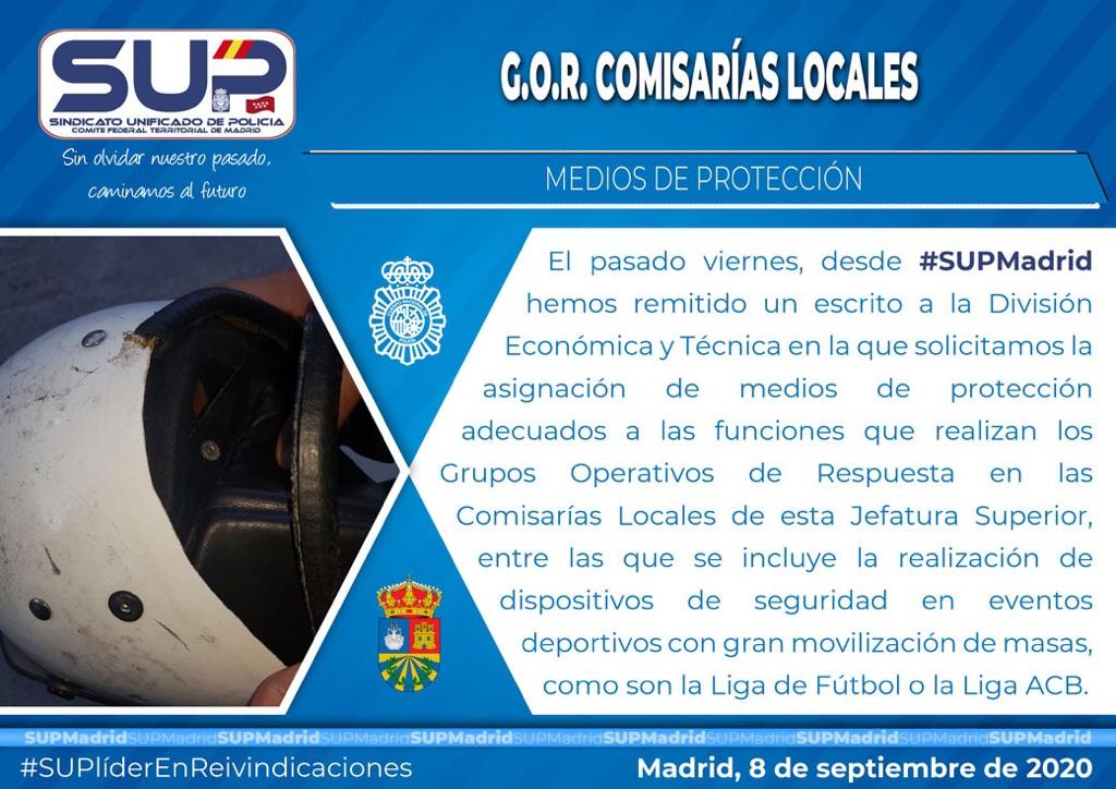 Volvemos a reiterar la petición que cursamos en septiembre de 2020 para que se dote a los GOR de las Comisarías Locales de los medios de protección adecuados para hacer frente con seguridad a los dispositivos de seguridad, contenciones de masas, alteraciones del orden públicos y eventos deportivos entre otros.