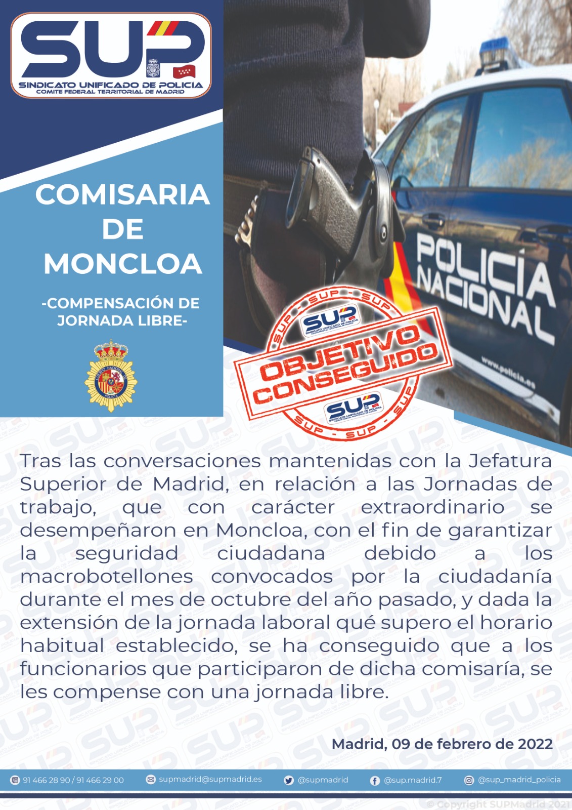 Tras gestiones realizadas por SUP Madrid con la JSP, en relación al exceso horario por los servicios realizados en los macrobotellones del distrito de Moncloa. Se consigue que se compense con una jornada a los Policías que participaron.