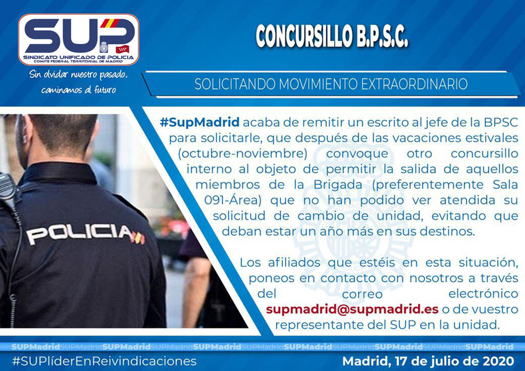 SUPMadrid solicita movimiento extraordinario para después del verano en la Brigada Provincial de Seguridad Ciudadana.