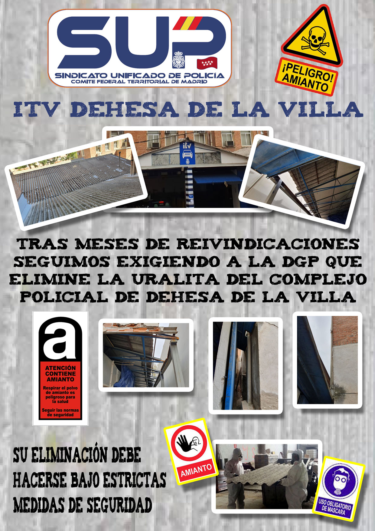 #SUPMadrid reitera la obligación a la DGP de la retirada de las uralitas que cubren el techo de la ITV de Dehesa de la Villa, así como de las diferentes bajantes. Así mismo recuerda la necesidad de llevar a cabo el trabajo salvaguardando la salud de los funcionarios allí destinados.
