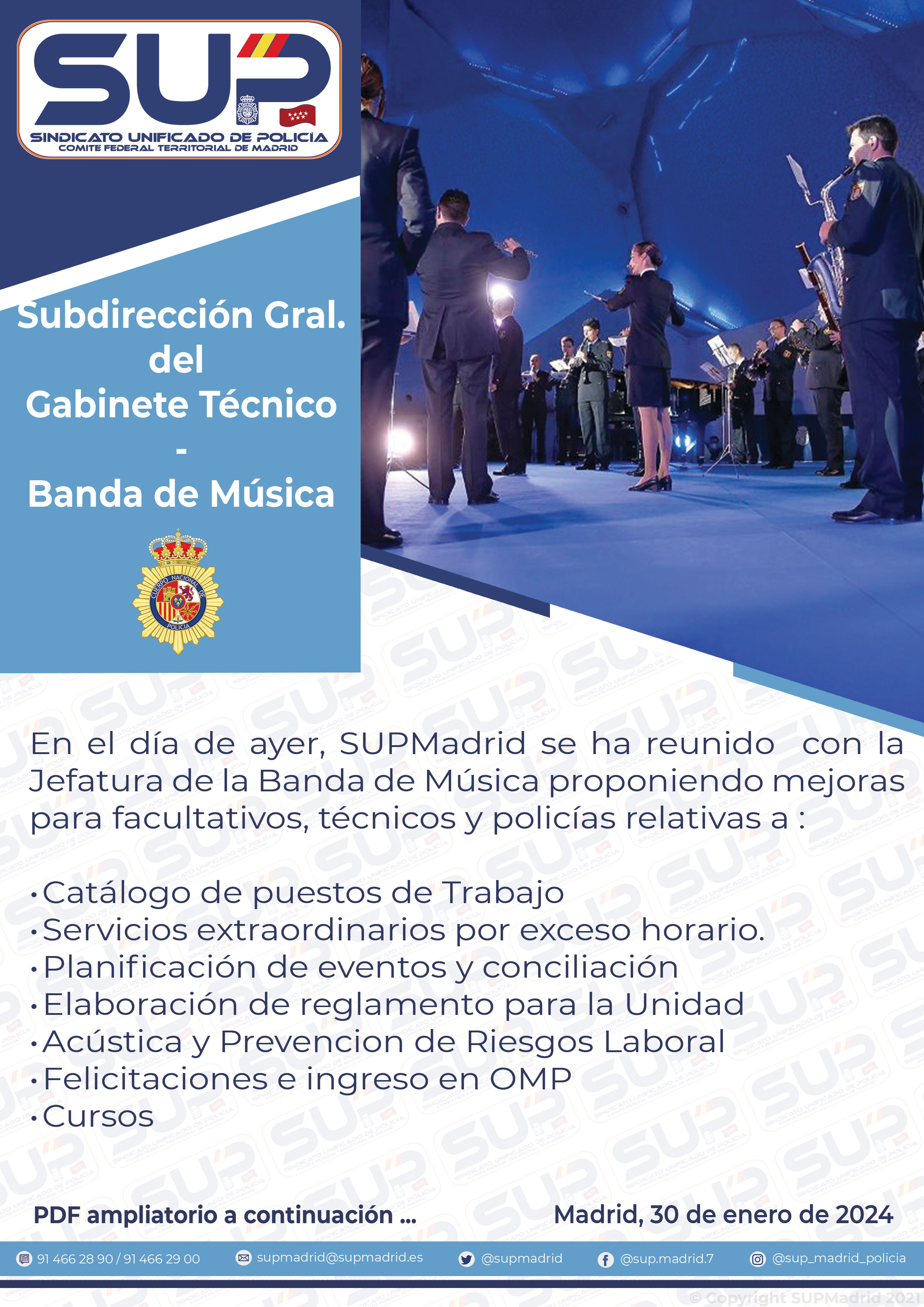 Espejo en el pasado para el resto de bandas sinfónicas, en el SUP Madrid hemos propuesto mejoras para todos sus integrantes (policías, técnicos y facultativos), así como para la Unidad. A continuación os adjuntamos una minicircular y pdf, explicando nuestras reivindicaciones.