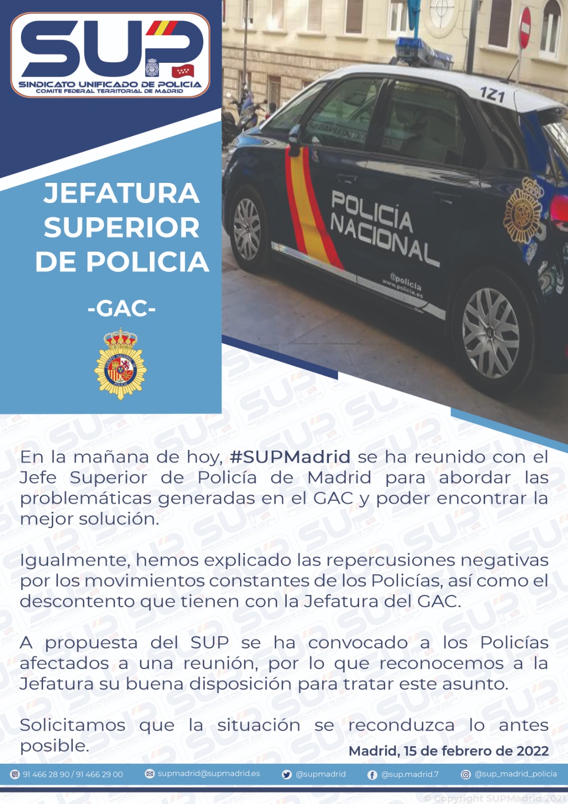 El 15 de febrero, el Comité de Madrid se ha reunido con el JSP de Madrid para abordar la problemática generada en el GAC. Informamos de las repercusiones negativas de movimientos continuos de Policías. A propuesta del SUP se ha convocado a los funcionarios afectados a una reunión el 16 de febrero en Jefatura.