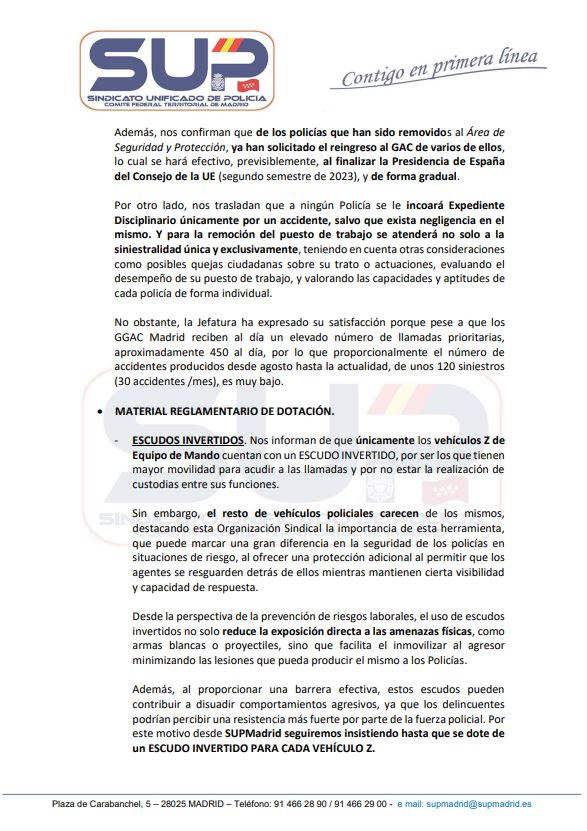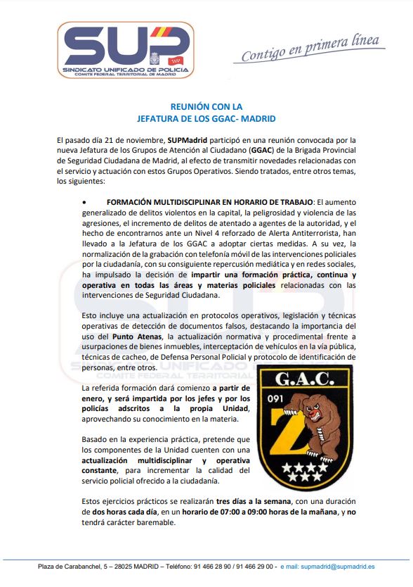 Recientemente el SUP Madrid se ha reunido con la Jefatura de los GGAC, donde entre otros, hemos tratado los siguientes temas: Formación, condecoraciones, remoción de puestos de trabajo, accidentes, material y táser.