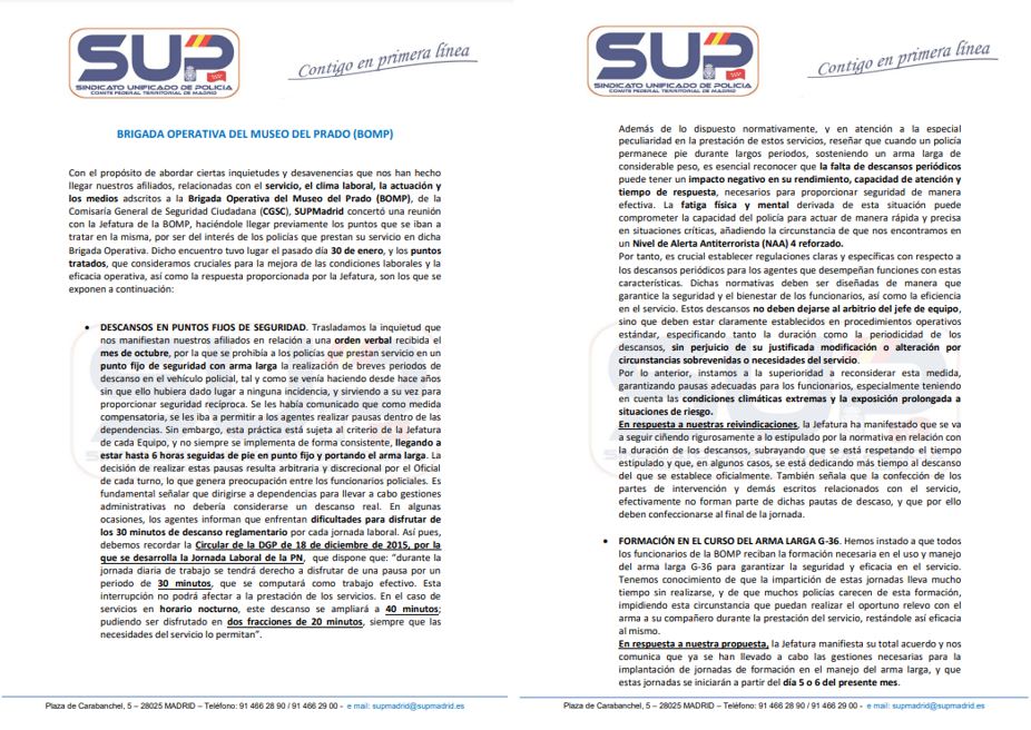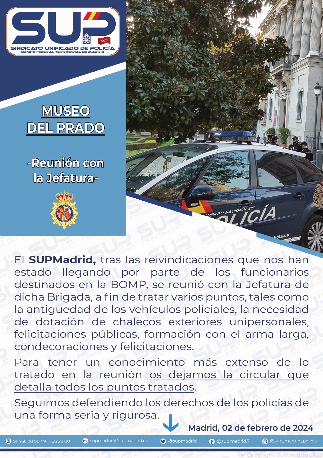 Nos reunimos con la Jefatura del Museo del Prado tratando los siguientes temas que nos hacéis llegar, tales como la antigüedad de los vehículos policiales, la necesidad de dotación de chalecos exteriores unipersonales, condecoraciones y felicitaciones y formación con arma larga. A continuación os adjuntamos una circular y pdf ampliatorio.