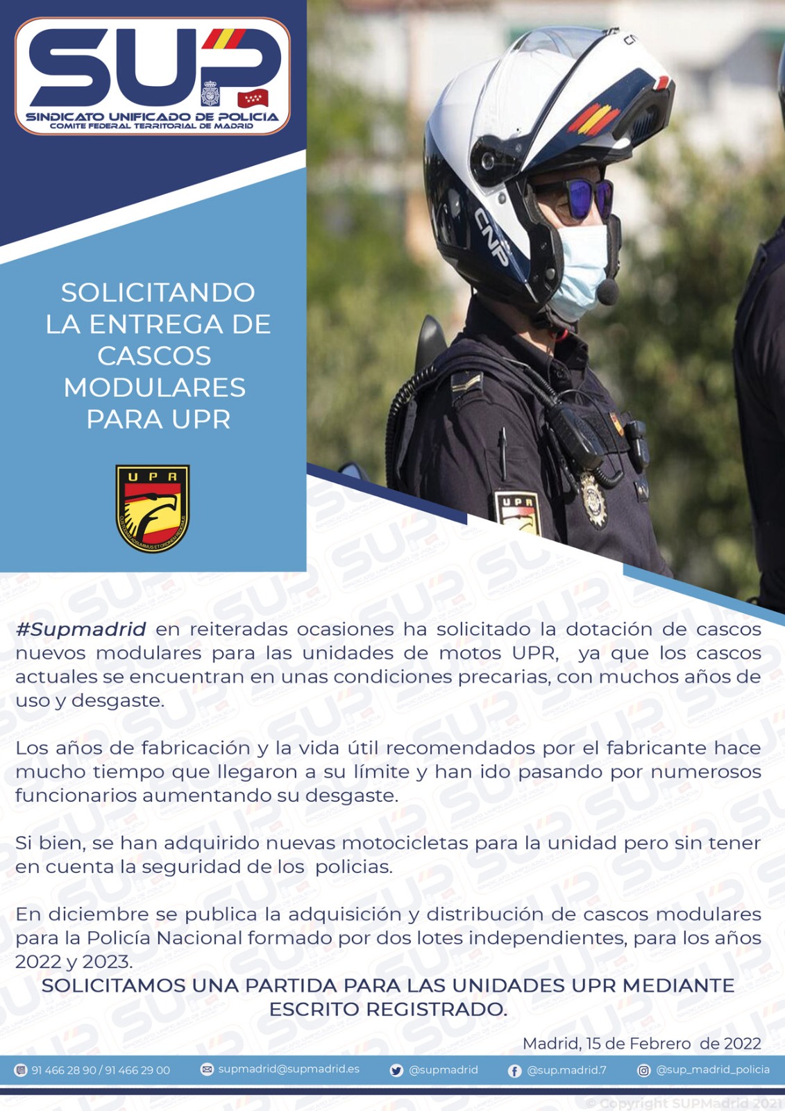 SUP Madrid ha solicitado en reiteradas ocasiones que se dote a la UPR de cascos modulares. Los cascos actuales se encuentran en condiciones precarias, con muchos años de uso y gran desgaste. Mediante escrito registrado solicitamos una partida para las UPR.