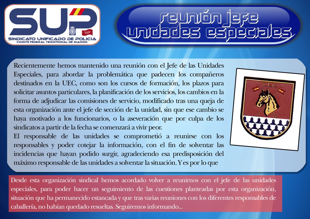 Pide las claves o cámbiala para acceder a la zona de afiliadosConsulta la informacion sobre la últuma reunion mantenida con el Comisario Jefe de las Unidades Especiales sobre las incidencias en la Unidad de Caballería de Comisaría General de Seguridad Ciudadana